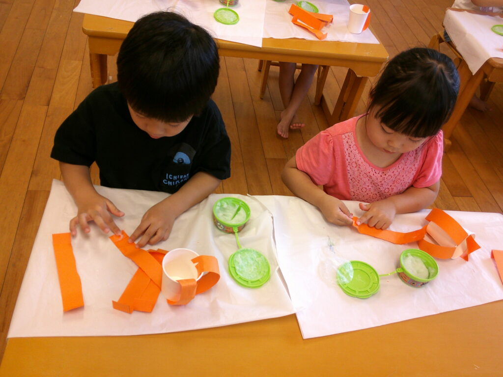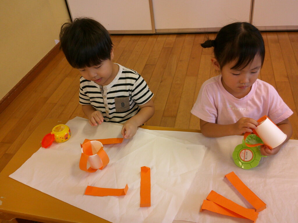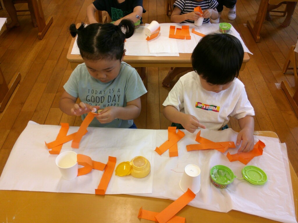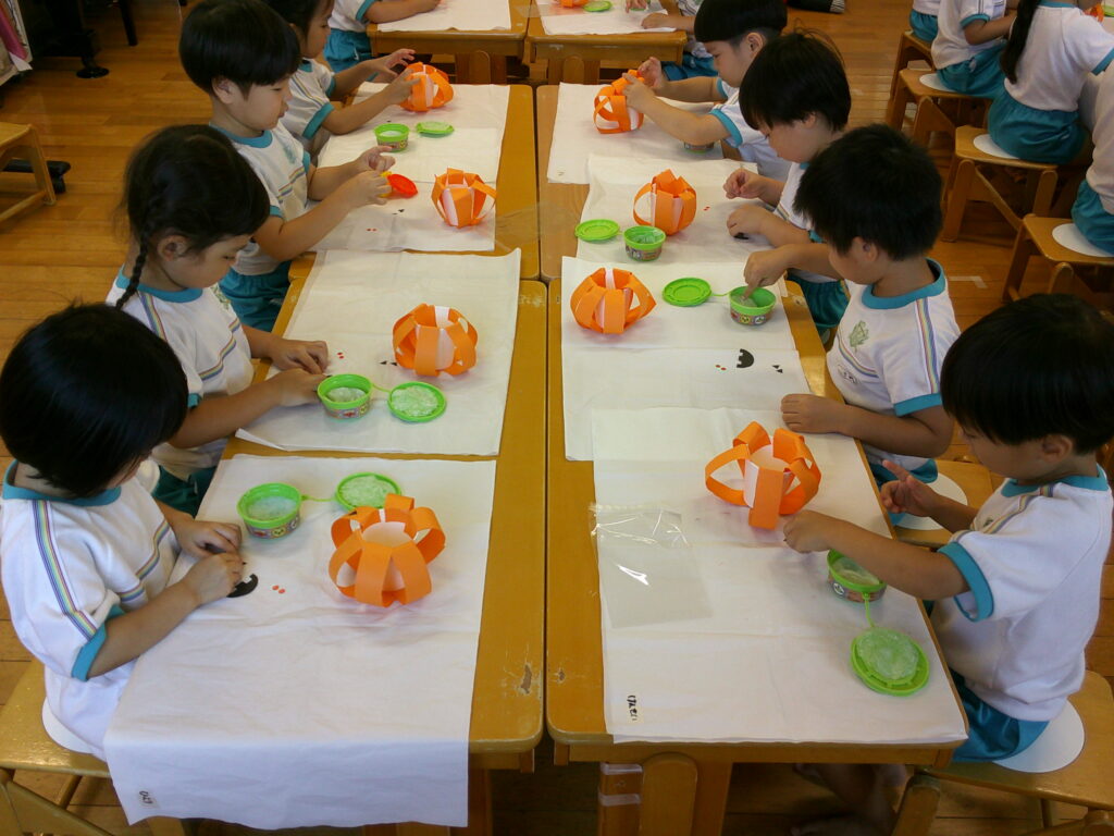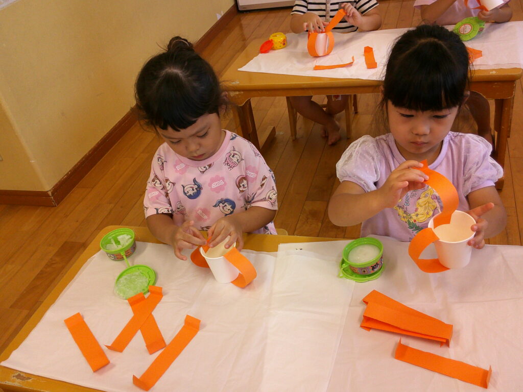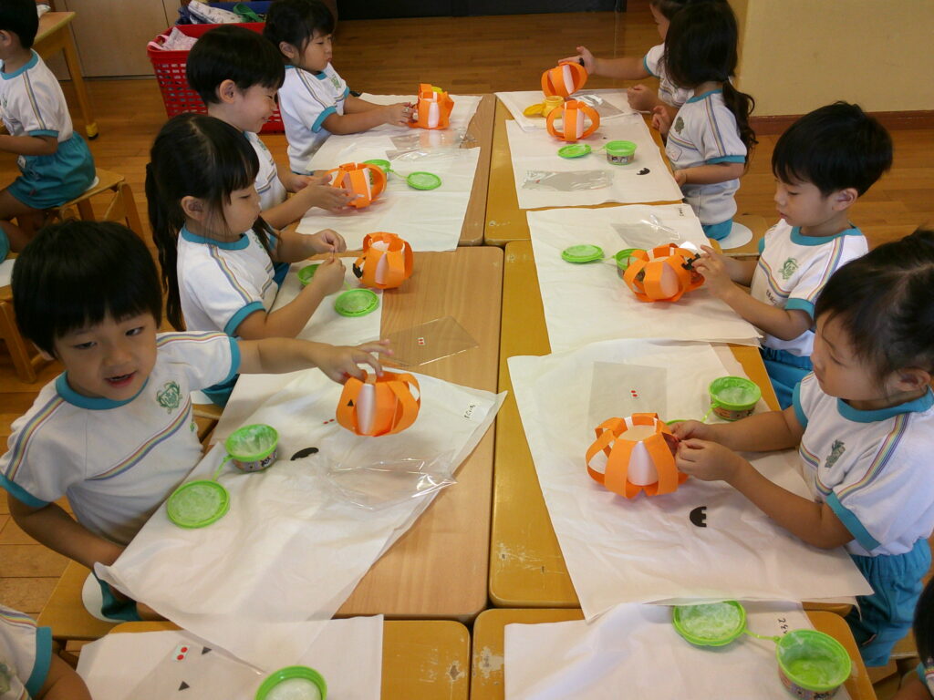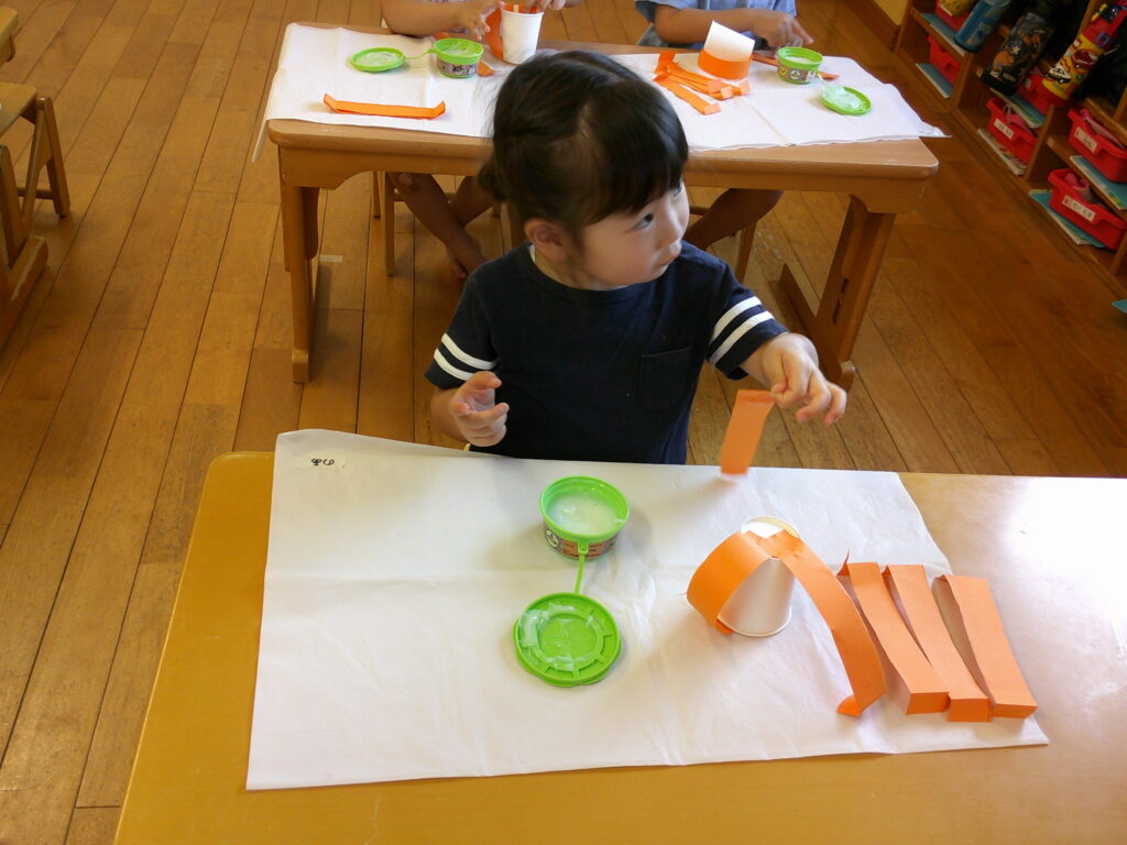 昨日今日の二日間でハロウィン製作をしました😆画用紙を細長く切って、紙コップに糊で貼り、オリジナルのジャックオランタンが出来ました🤩同じパーツを使ってもそれぞれ違うお顔になっていて可愛かったです🥰来週持ち帰りますので、お楽しみに💫
