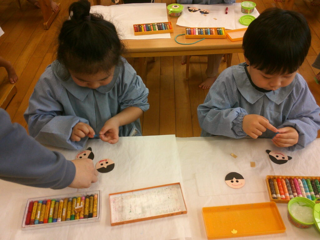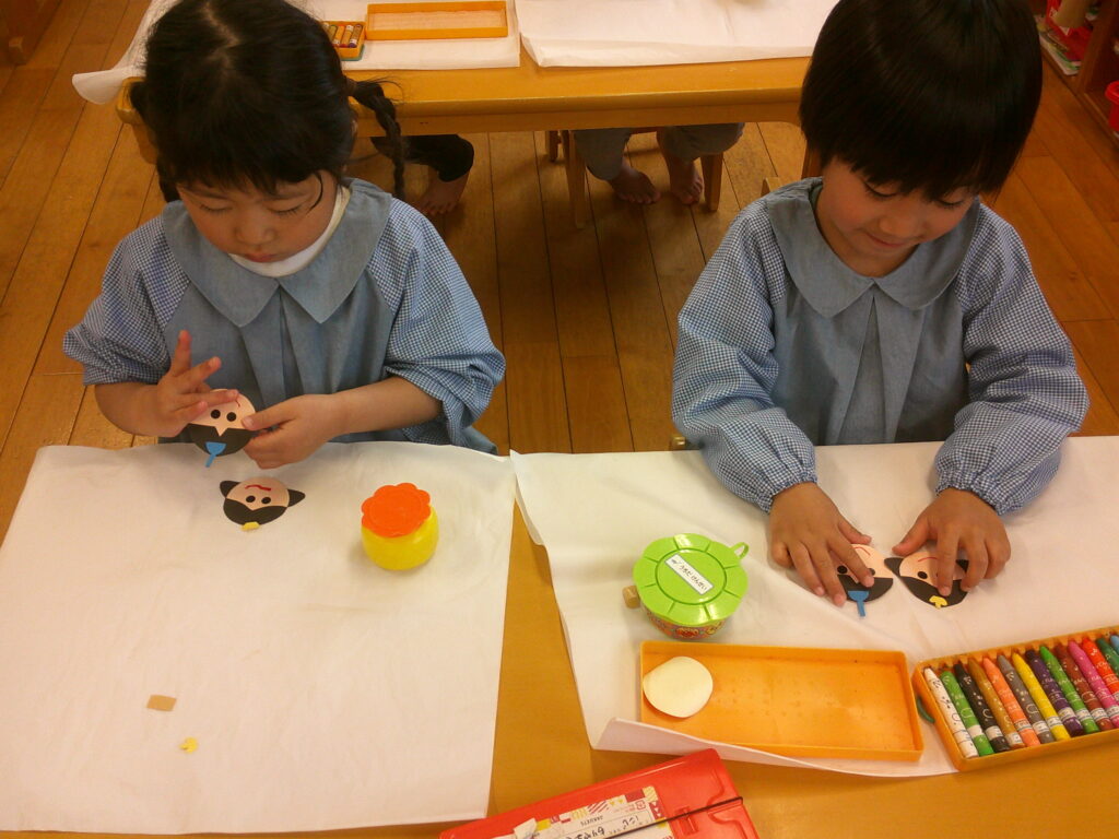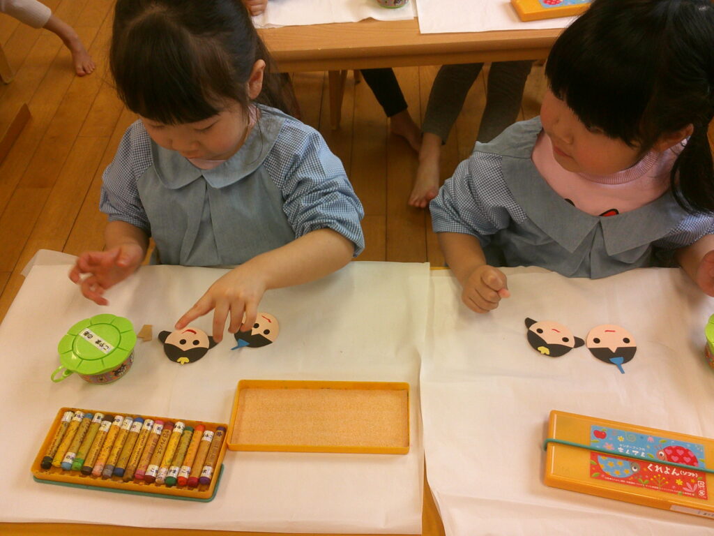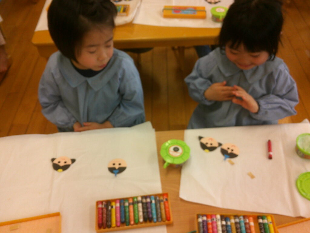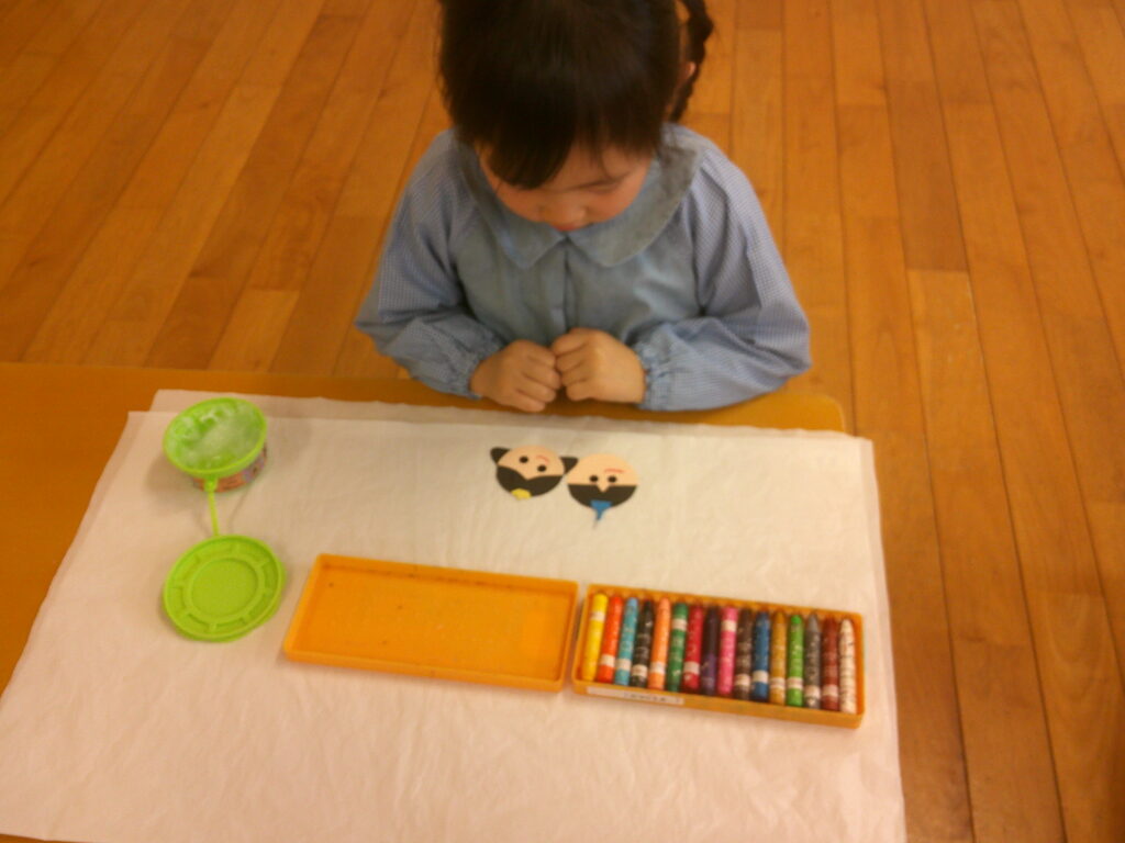 お顔に目のシールを貼ったりクレヨンで口を描いたりしながら、それぞれ個性のあふれる可愛いお内裏様とお雛様が出来ました❤️「可愛くできた!」の声が沢山聞こえていました🥰