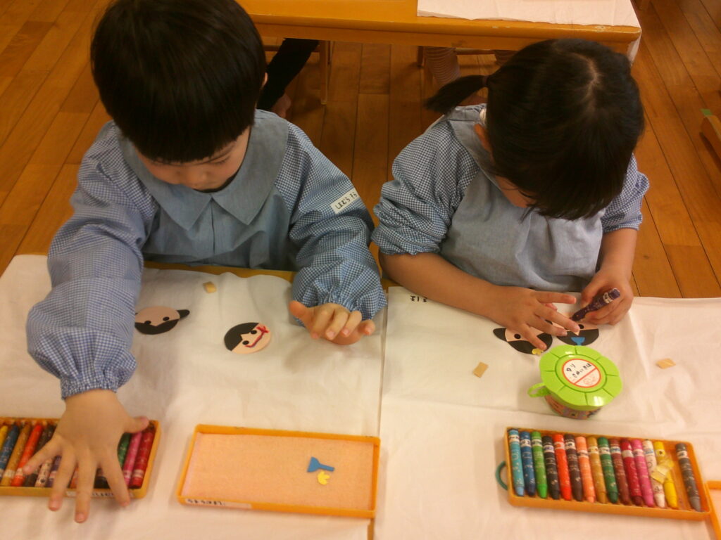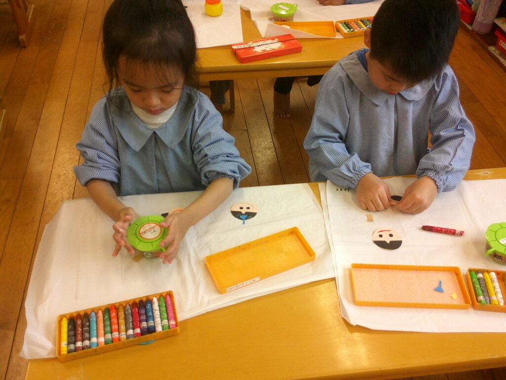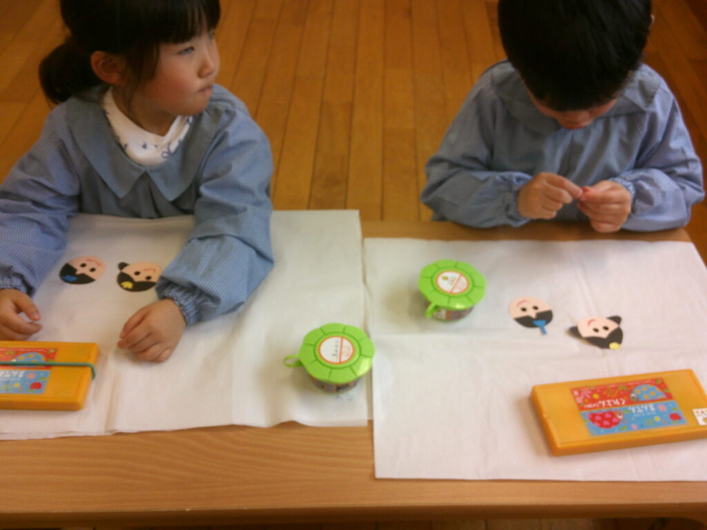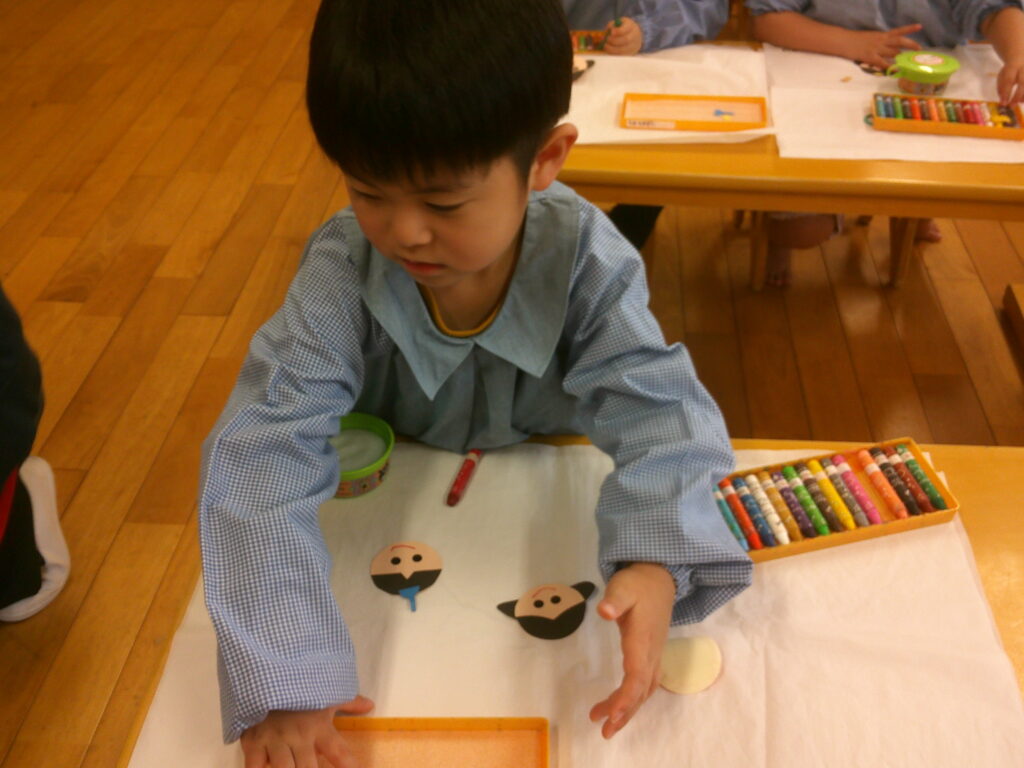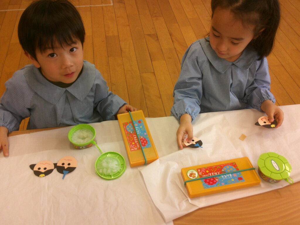 お顔に目のシールを貼ったりクレヨンで口を描いたりしながら、それぞれ個性のあふれる可愛いお内裏様とお雛様が出来ました❤️「可愛くできた!」の声が沢山聞こえていました🥰