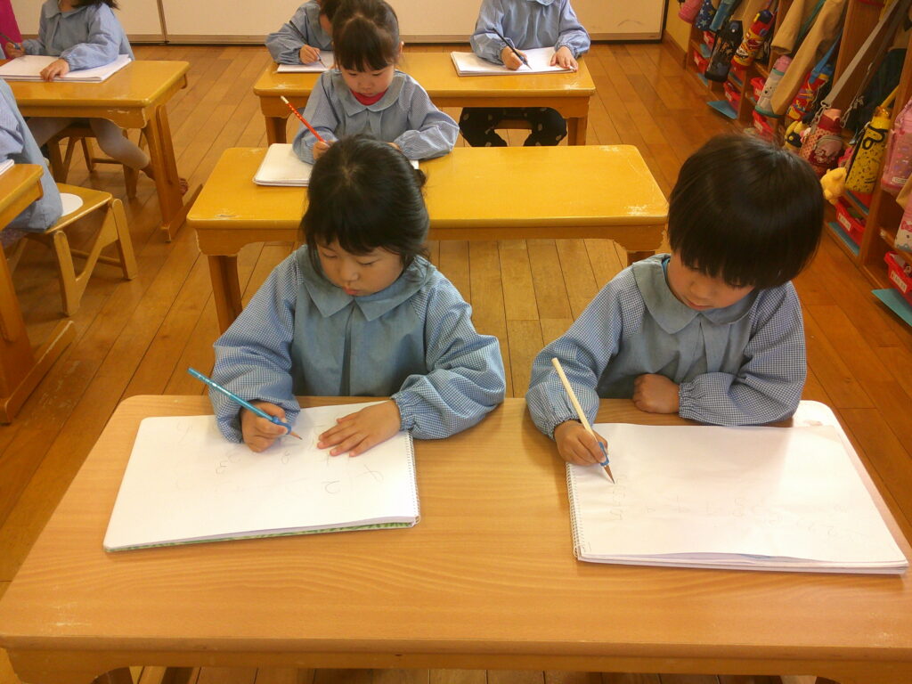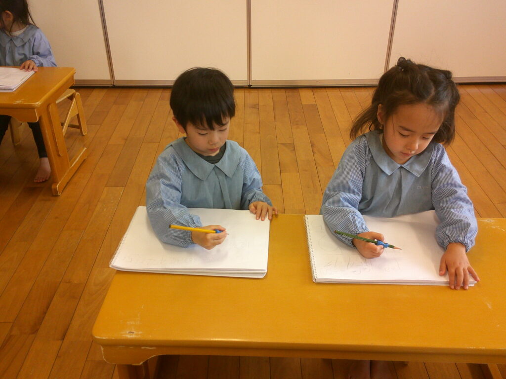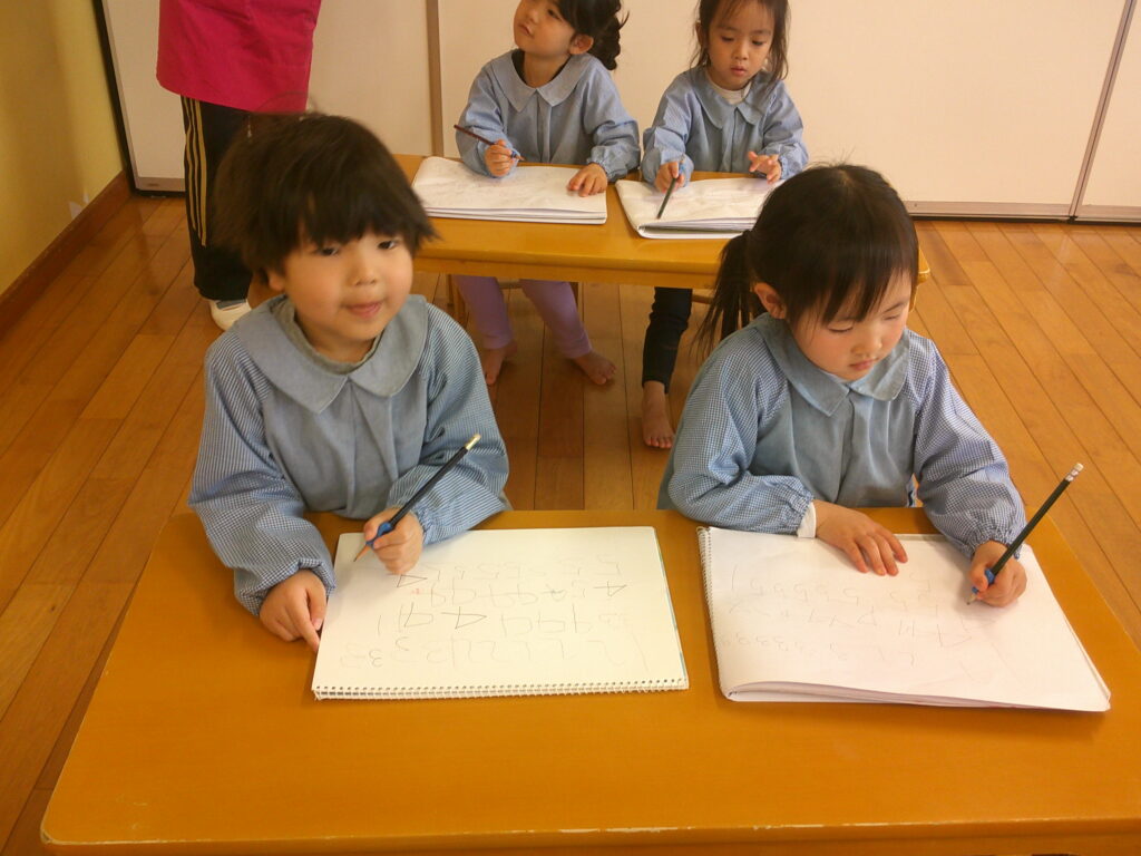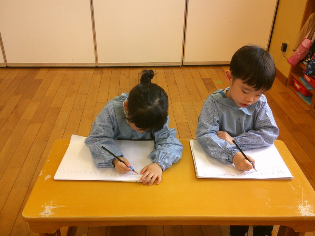 口で書き順を言うのは出来ても実際に書いてみると難しく、「できな~い😣」と言う声もあちらこちらから聞こえてきました。でも最初から上手にできる人はいないんだよ、練習することが大事だよ、とお話すると頑張って書く姿が見られました🔥