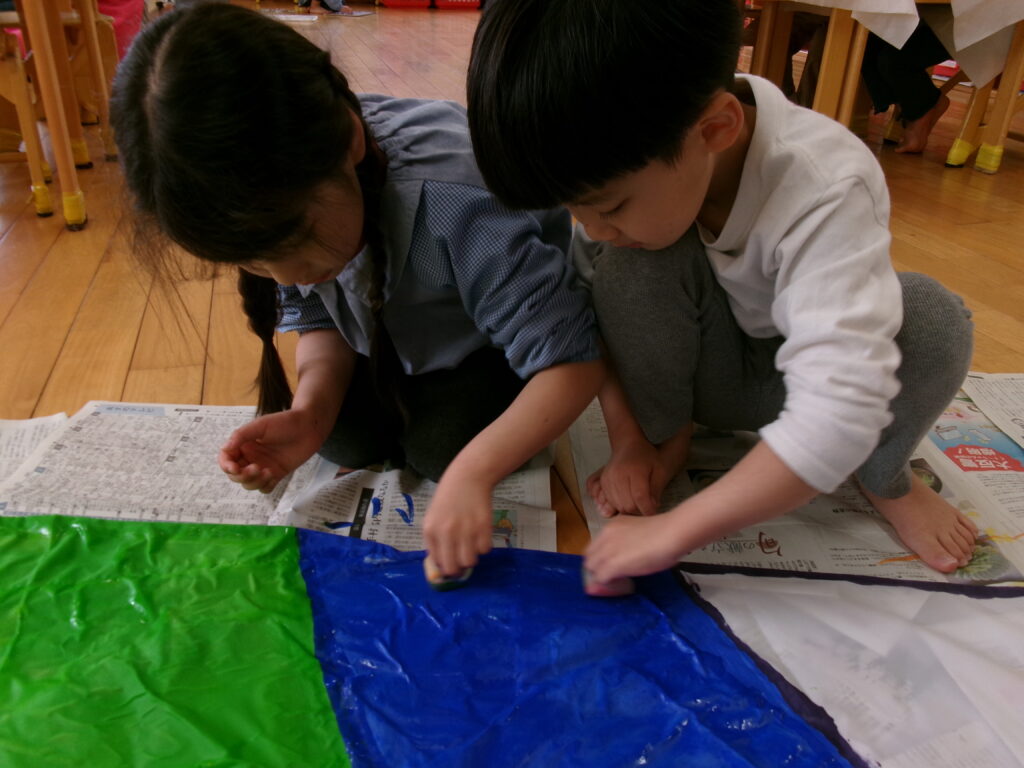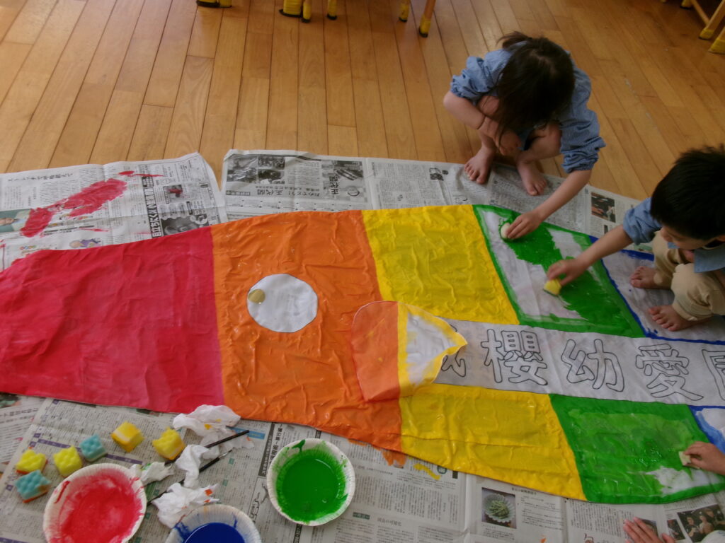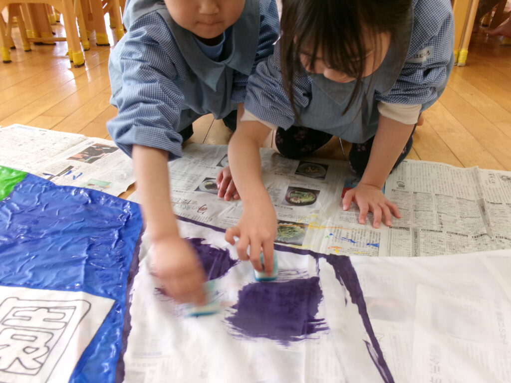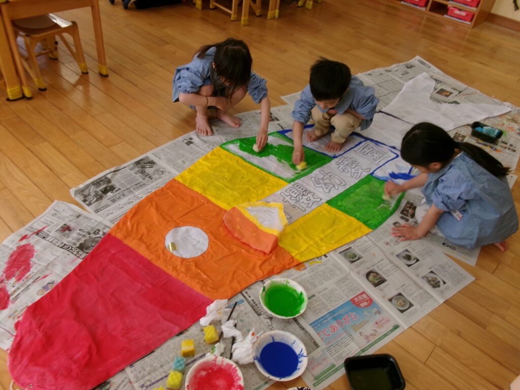 大きくて真っ白なこいのぼりをどんな色にしようかみんなで話し合い、
