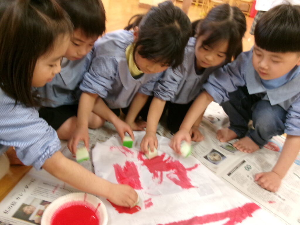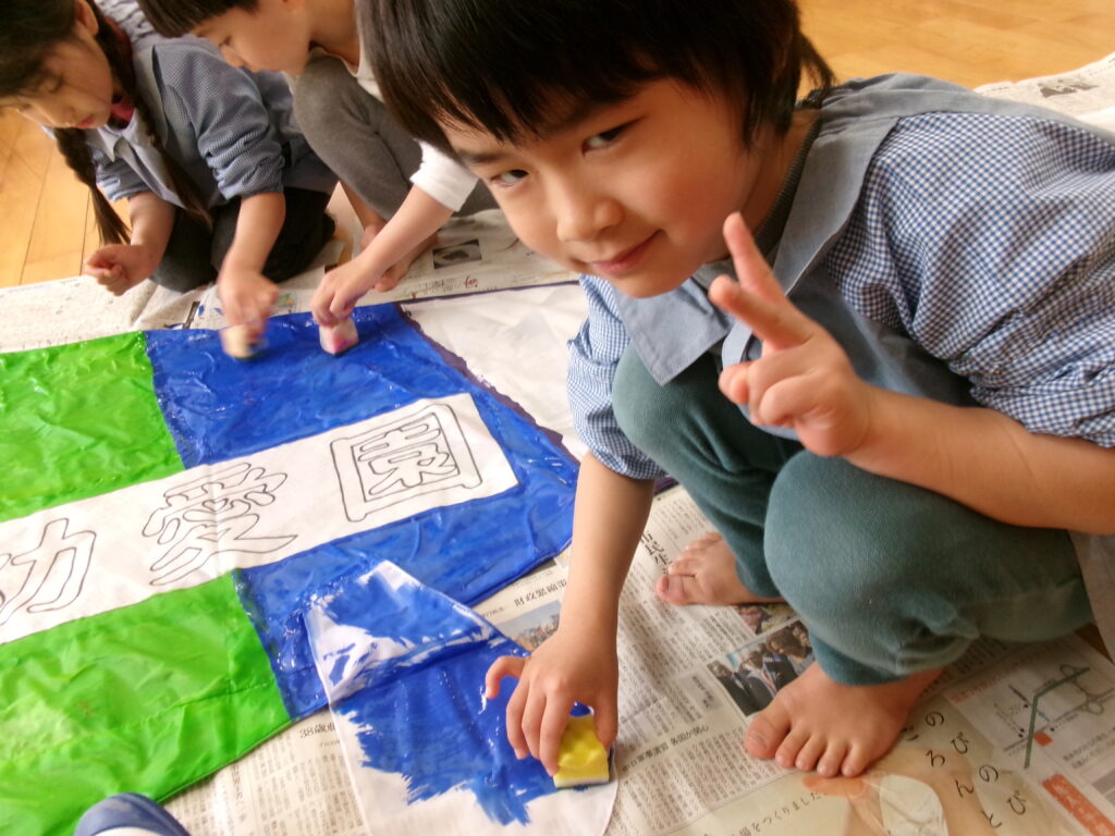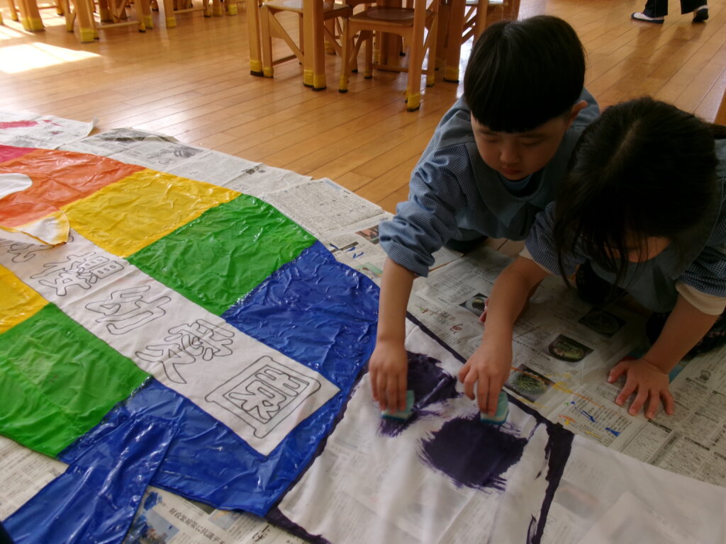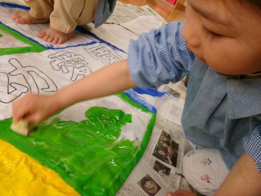 大きくて真っ白なこいのぼりをどんな色にしようかみんなで話し合い、