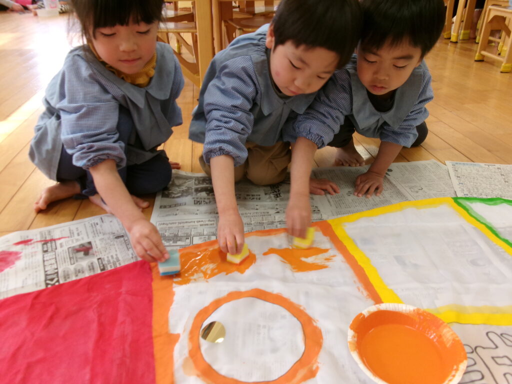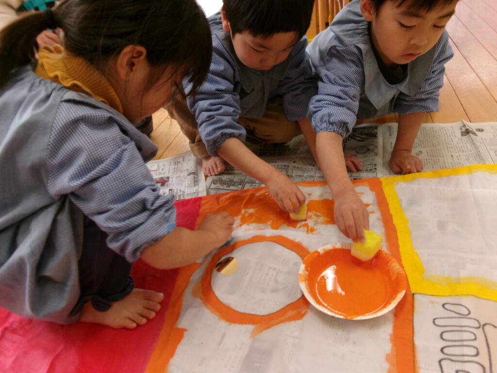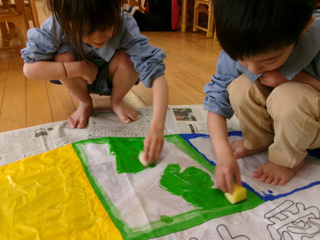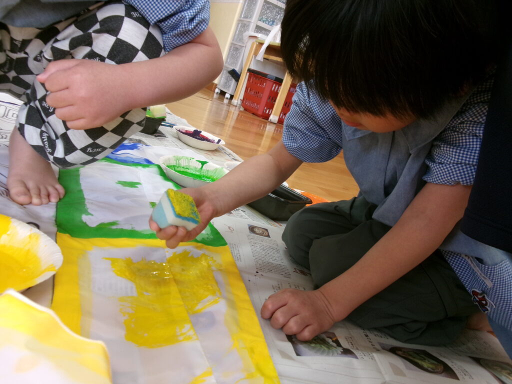 スポンジで色塗りすることは初めてで、「おもしろい!」「いっぱい色つくね」