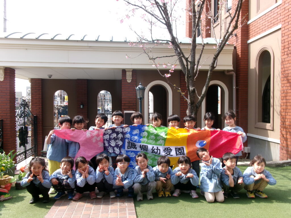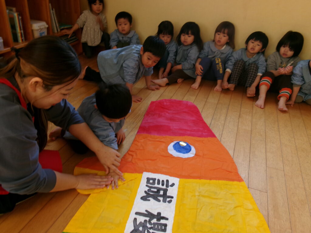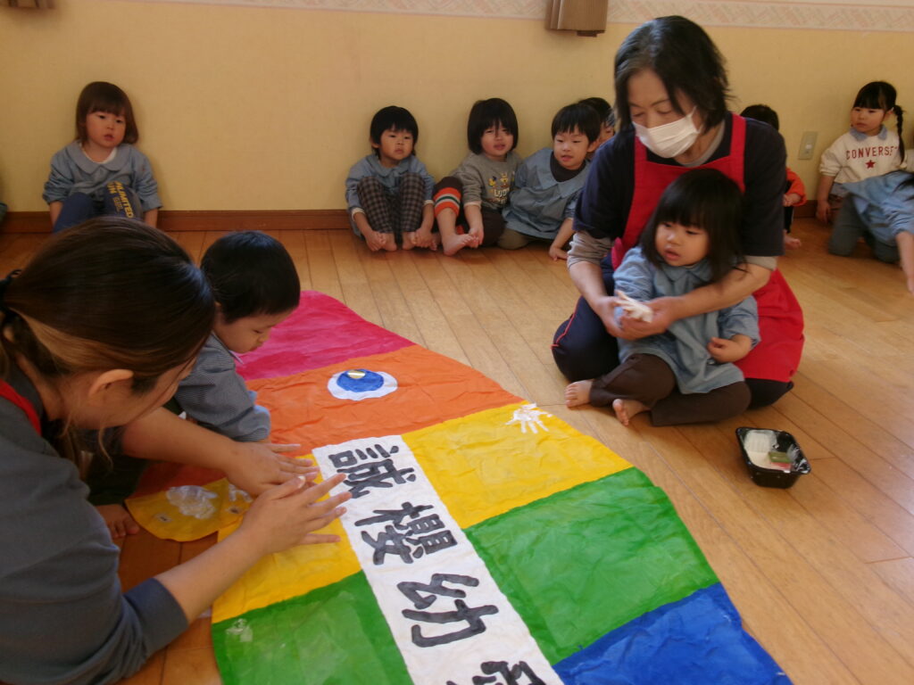 三月上旬にもも組さんみんなで、大きなこいのぼりを作りました🩵