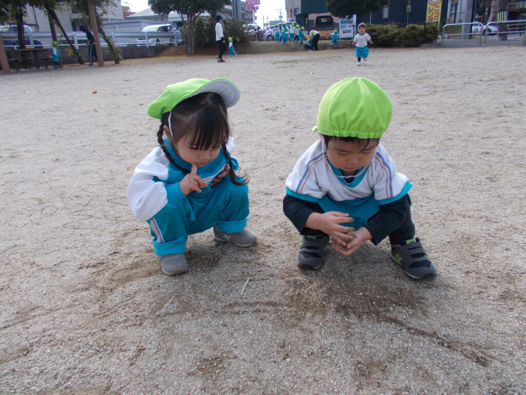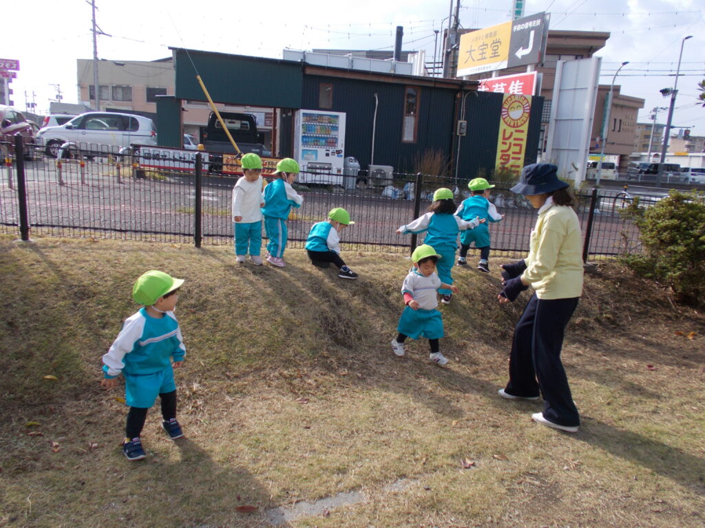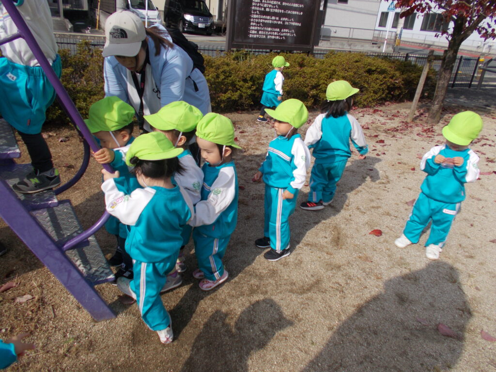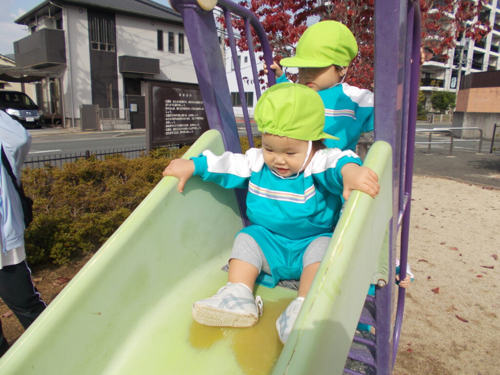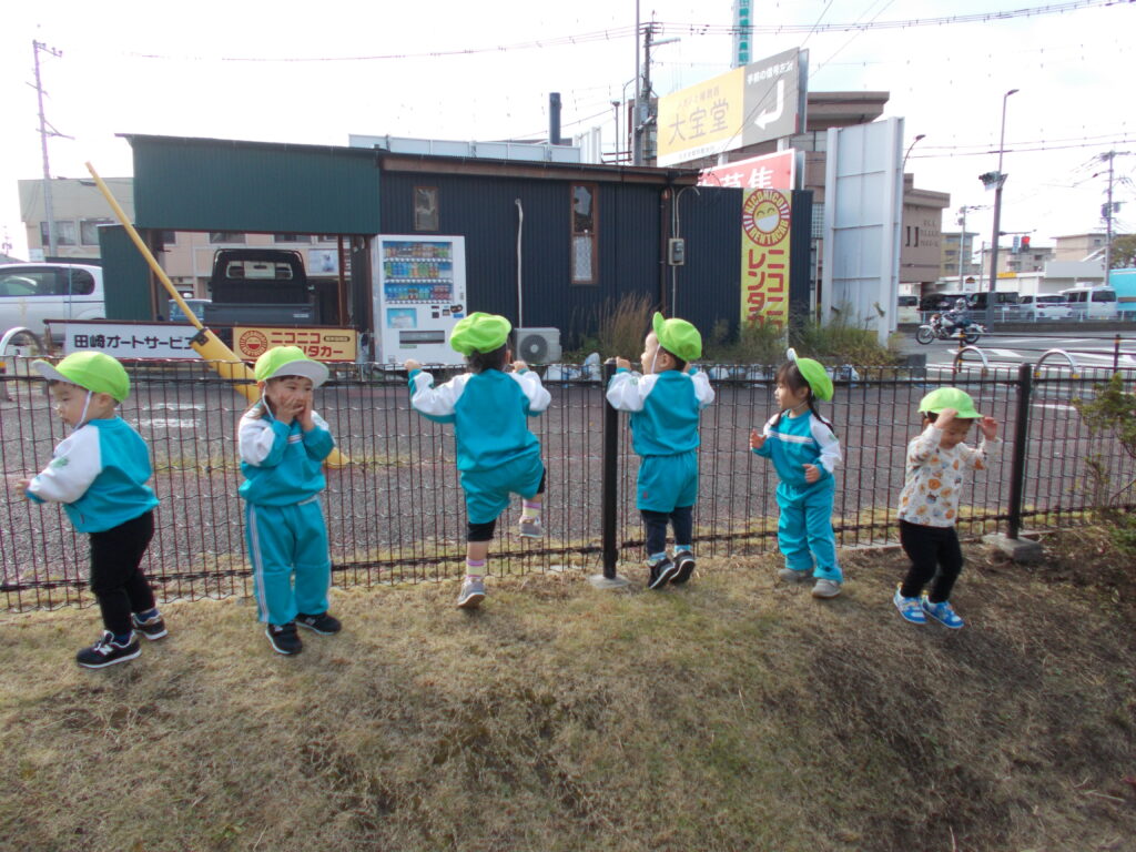すべり台では「じゅんばん!」とお互いに言い合いながら、順番を守ったり、柵の近くに行き車に「やっほー!」と声を出したりと、園での外遊びとはまた違う姿を見ることができました😆✨