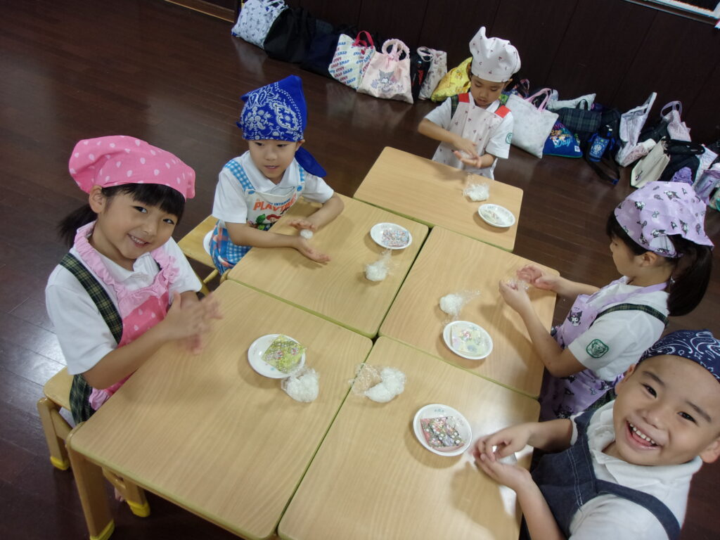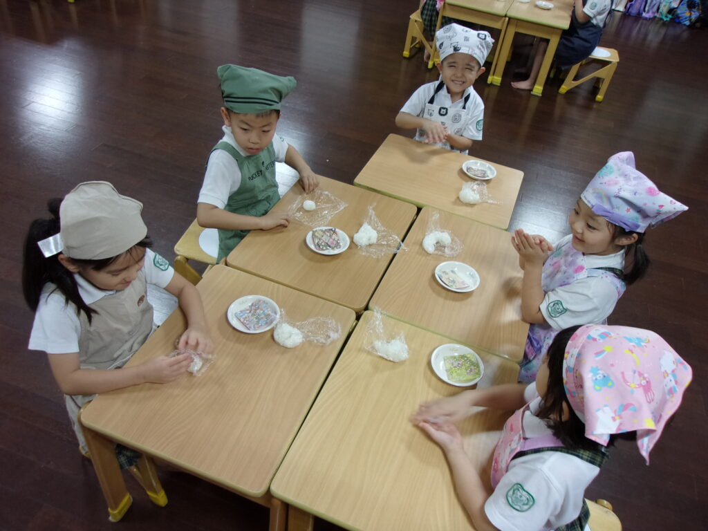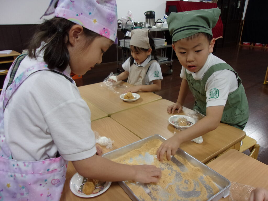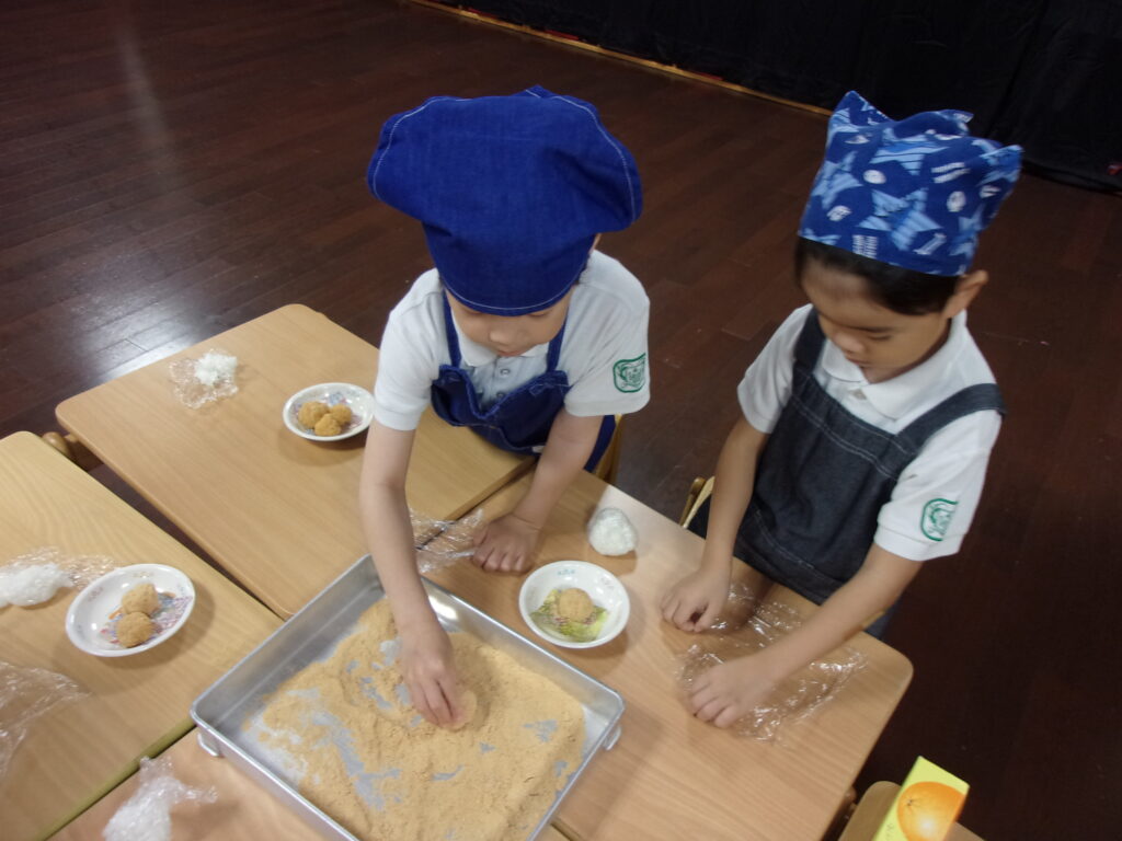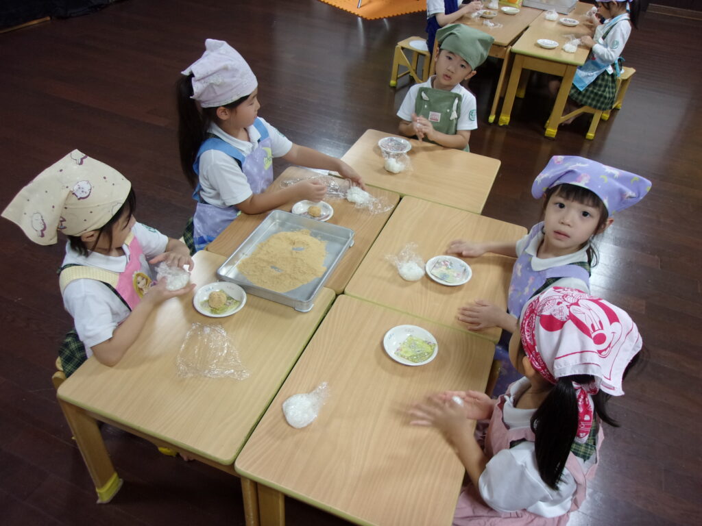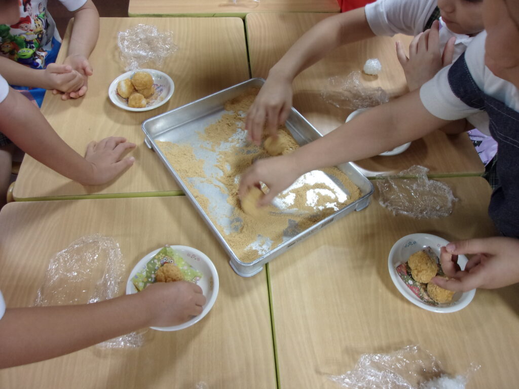 同じ班のお友達と譲り合いながらごはんにきな粉をつけていきます😆