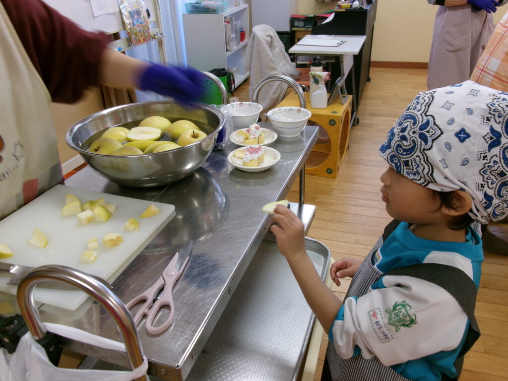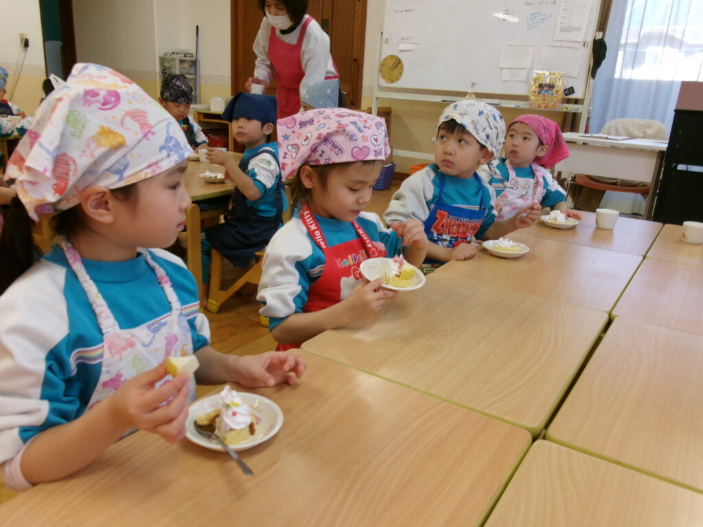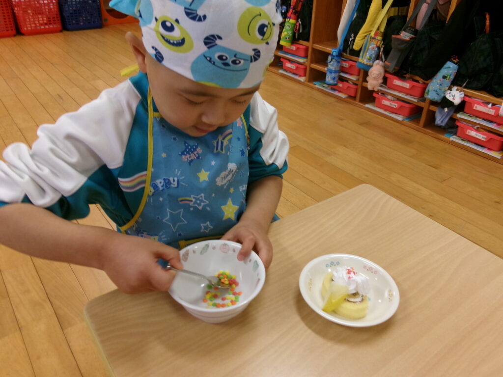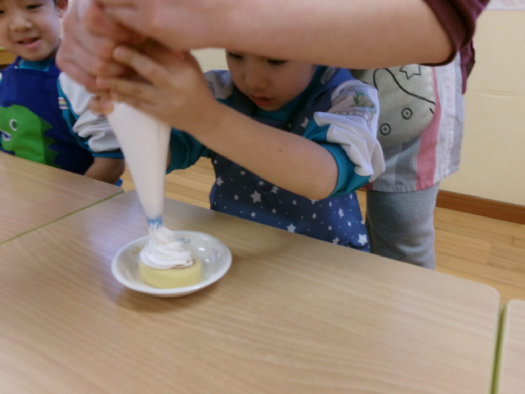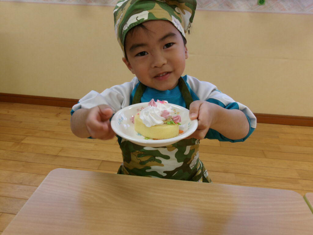 生クリームやリンゴなど思うままにのせて美味しそうなケーキが出来ました✨
