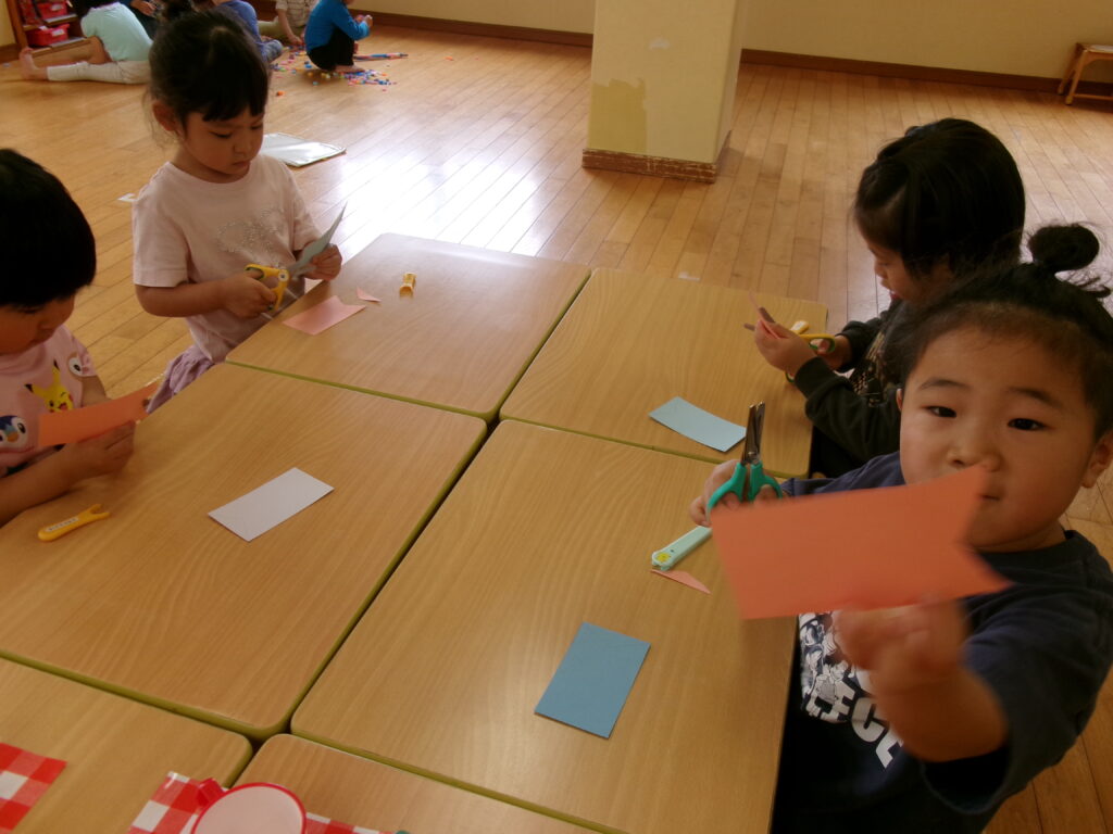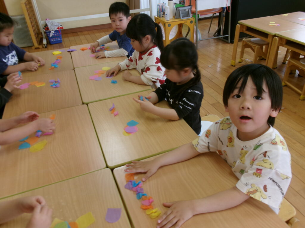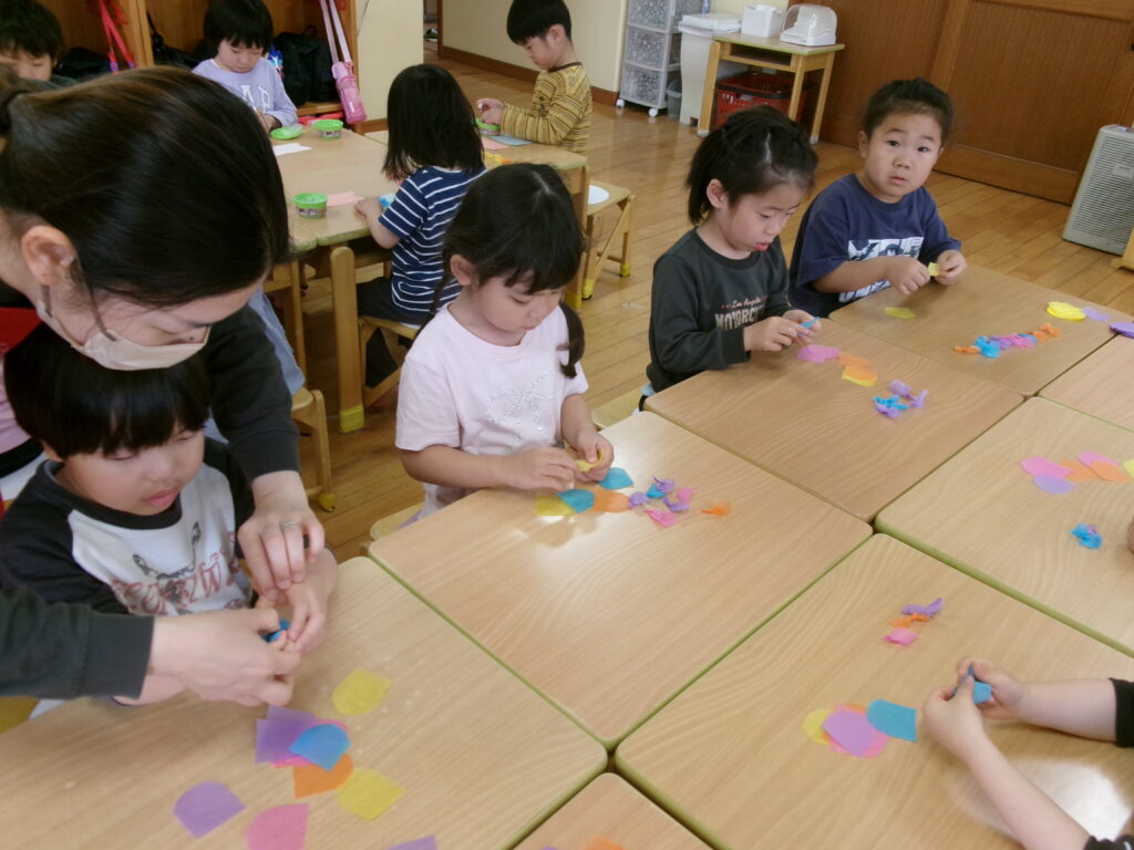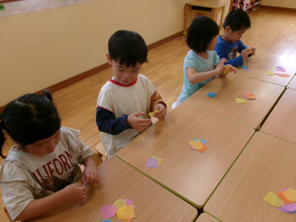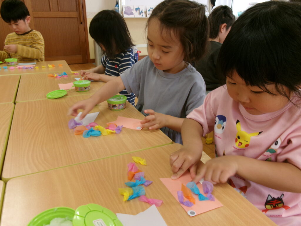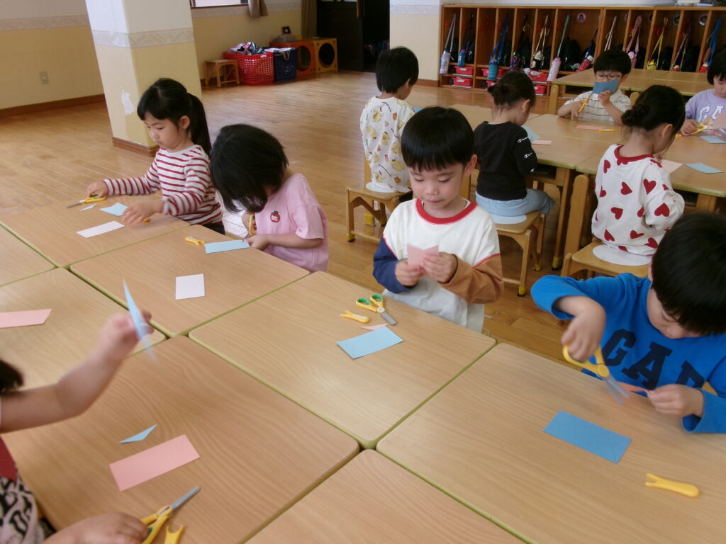 ハサミを使って画用紙をこいのぼりの形に切り、花紙で鱗を表現しました✨