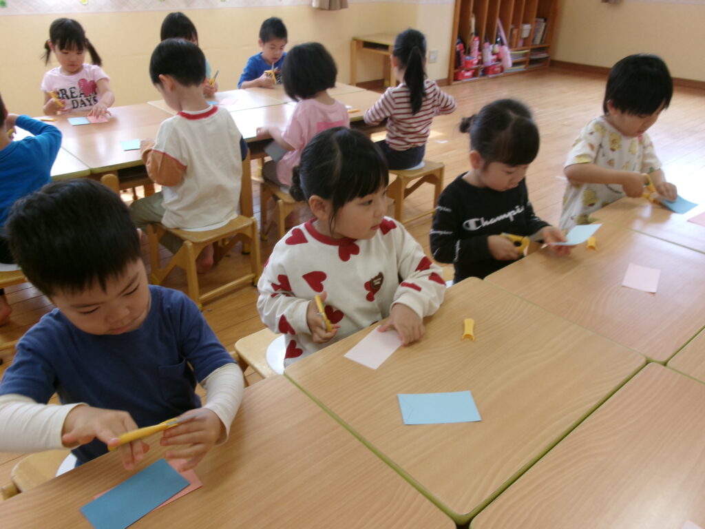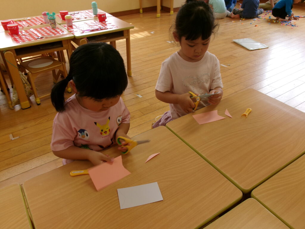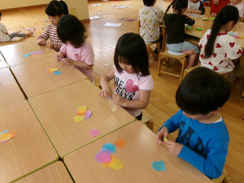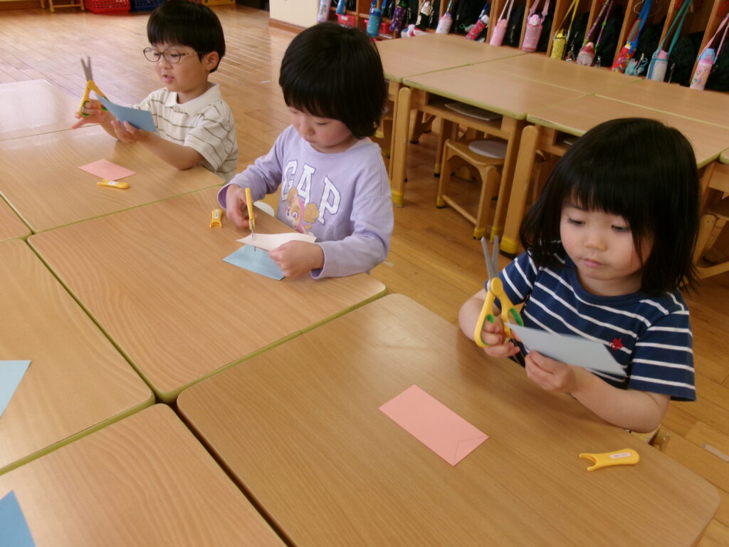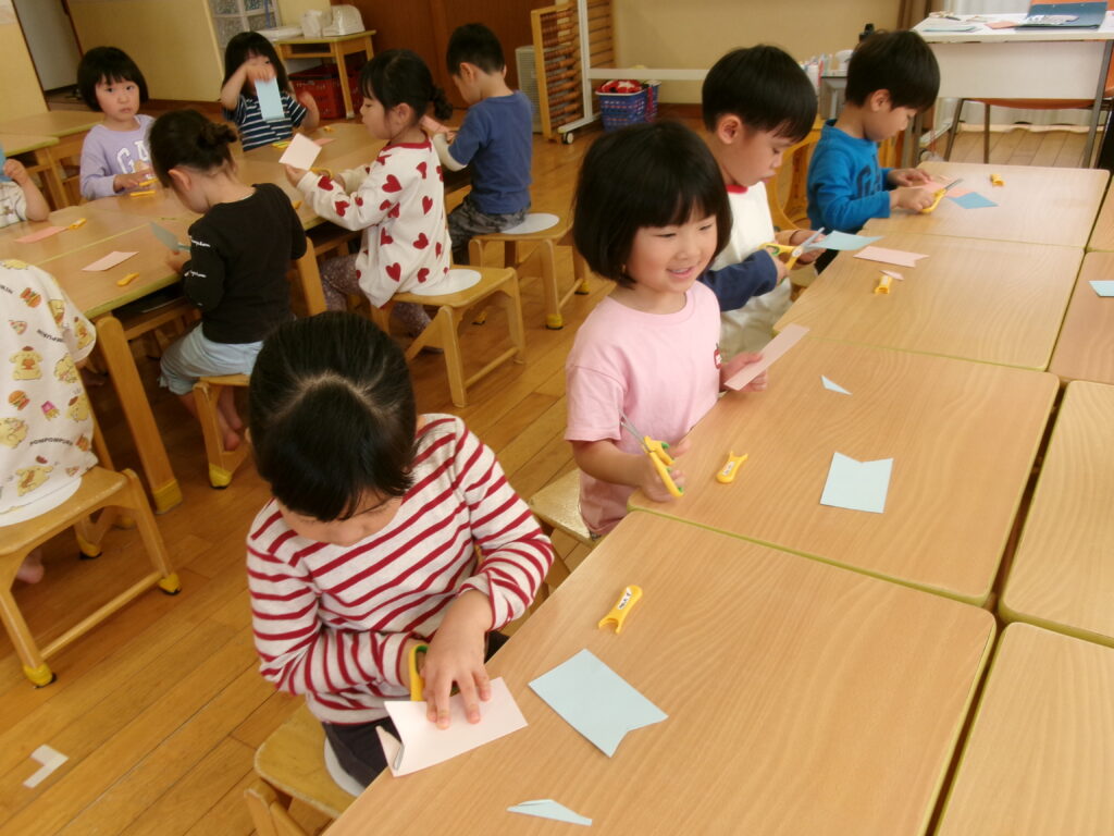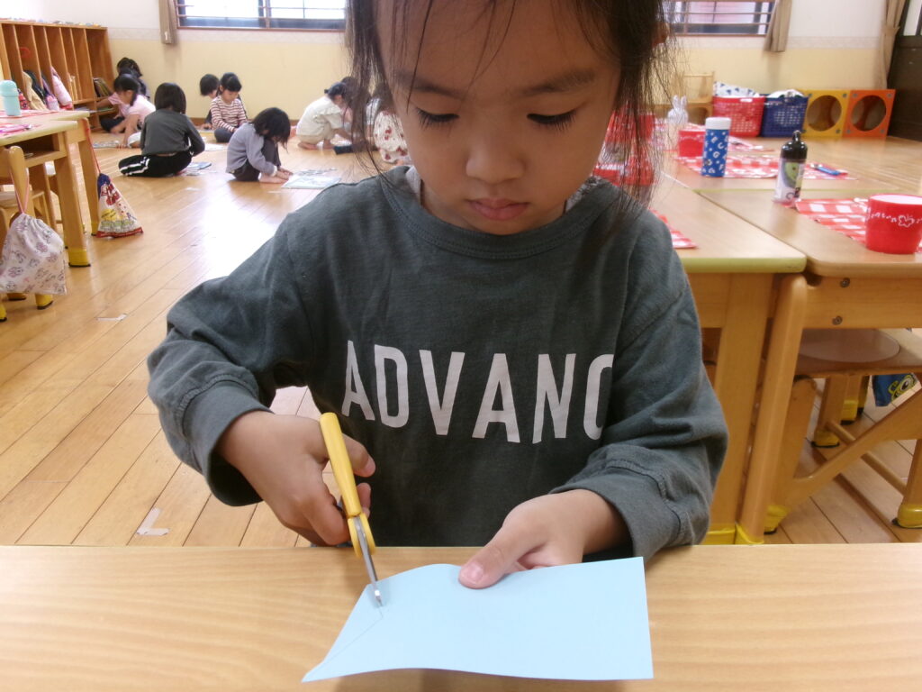 ハサミを使って画用紙をこいのぼりの形に切り、花紙で鱗を表現しました✨