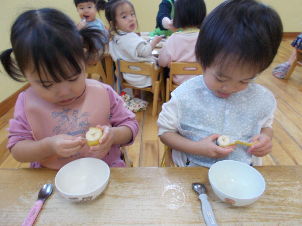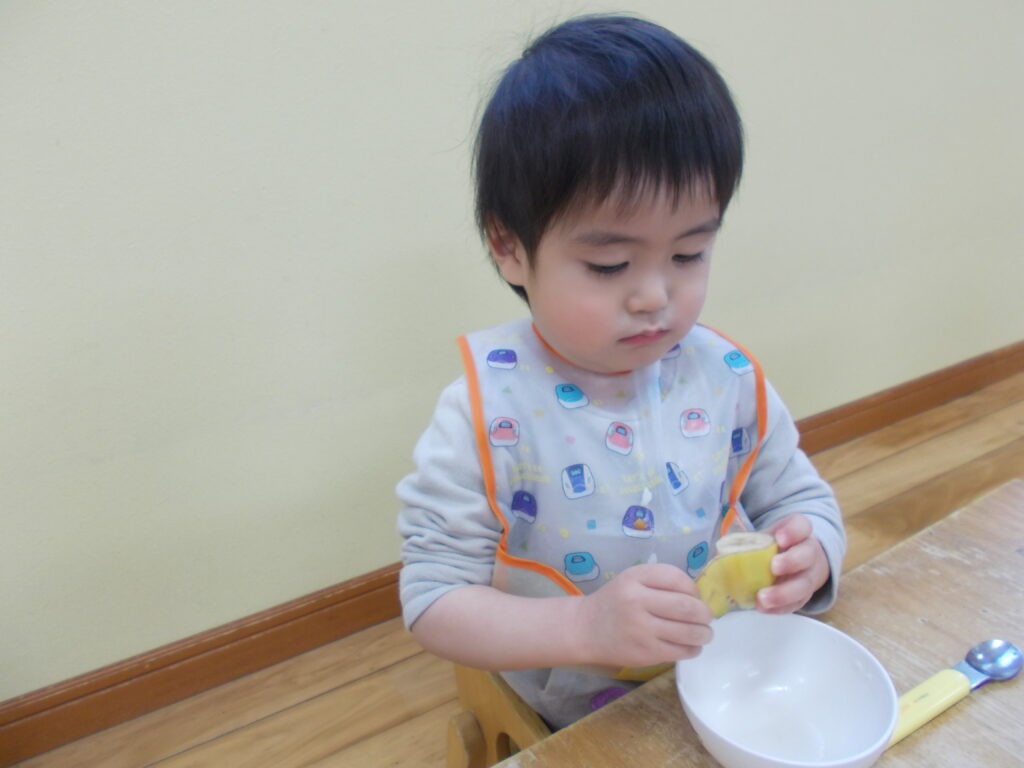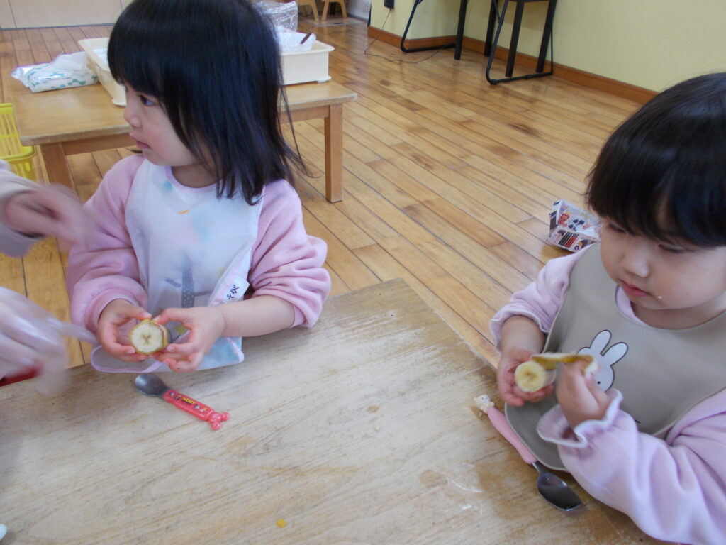 切れ目が入ったバナナを、じーっと見つめる子どもたち🍌