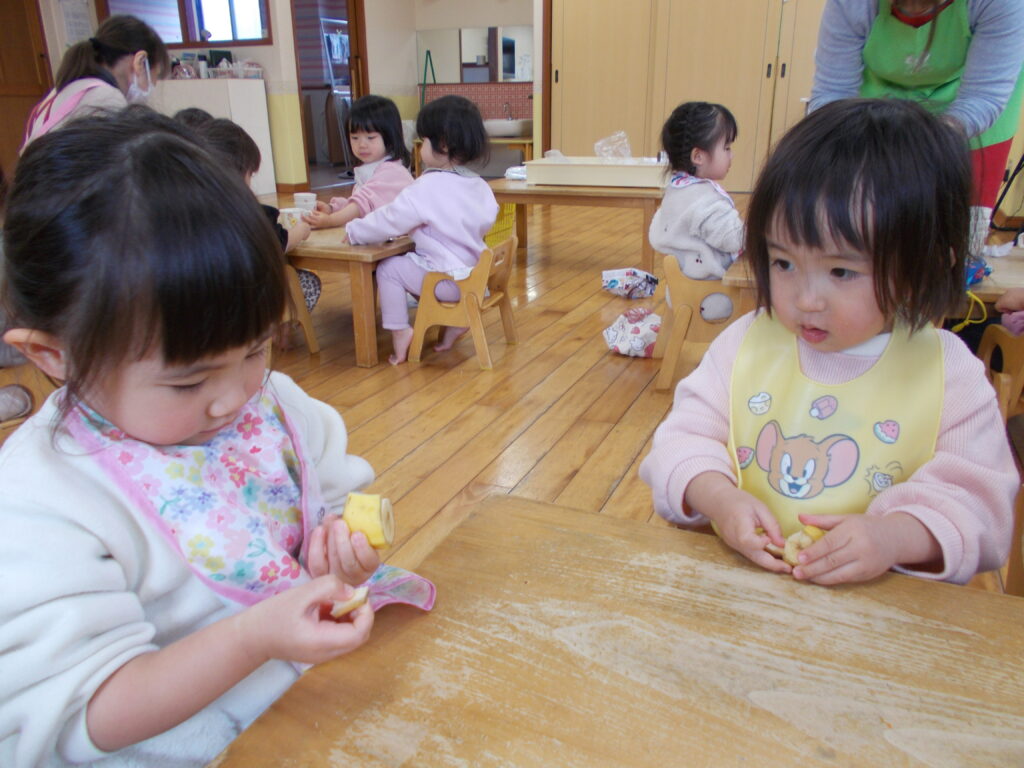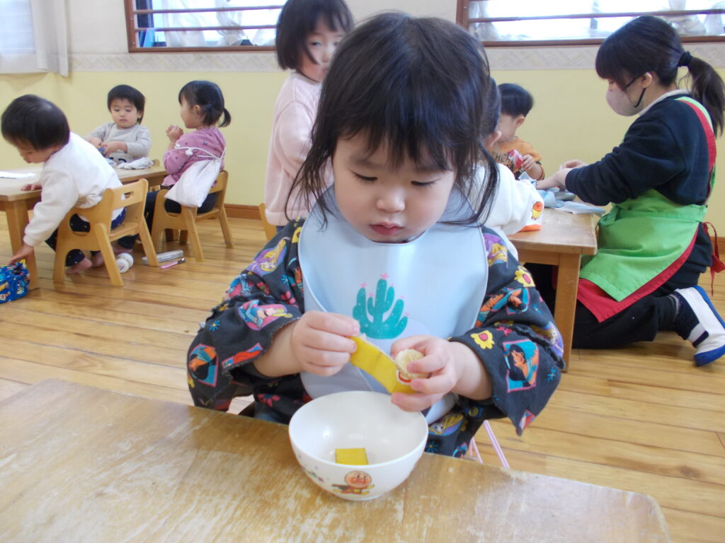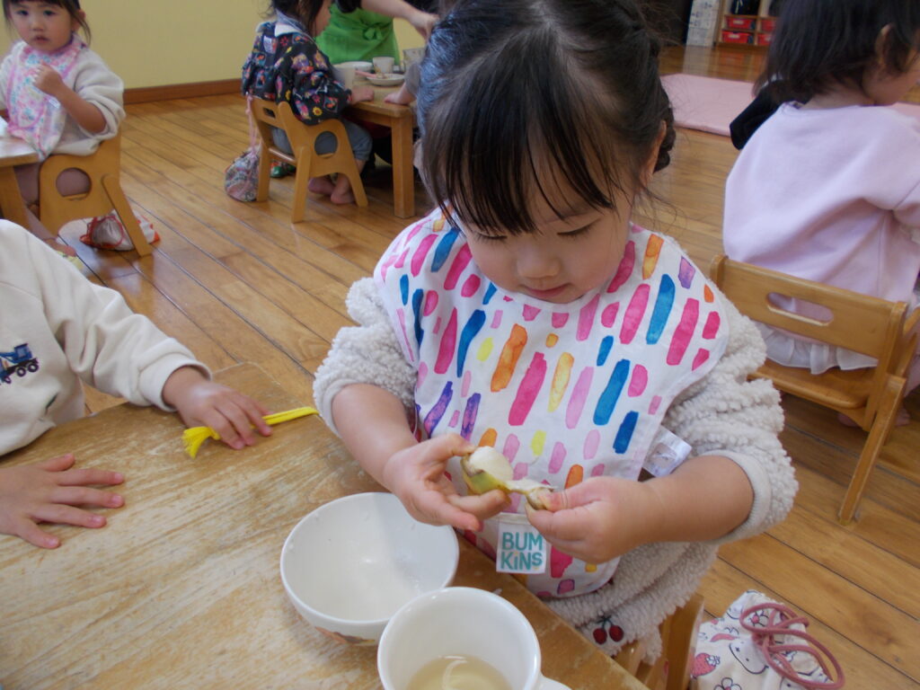 指先に力を込めて皮を引っぱったり、不思議そうに触ってみたりと、それぞれのペースでチャレンジする姿が見られました😊👍