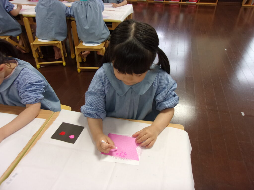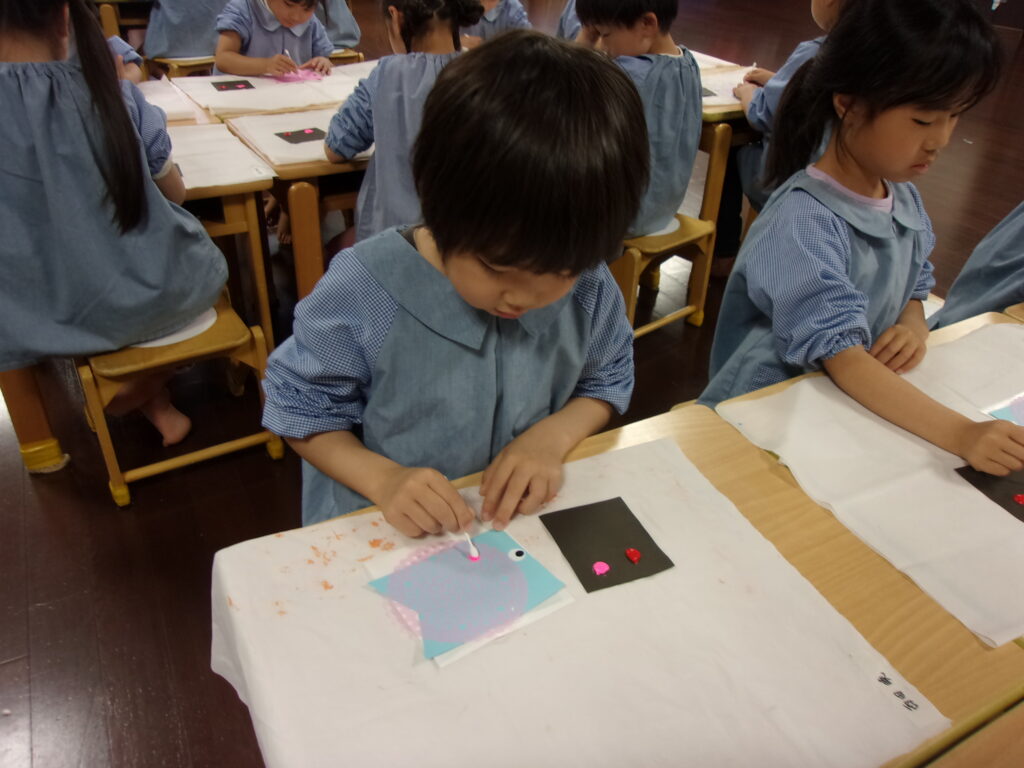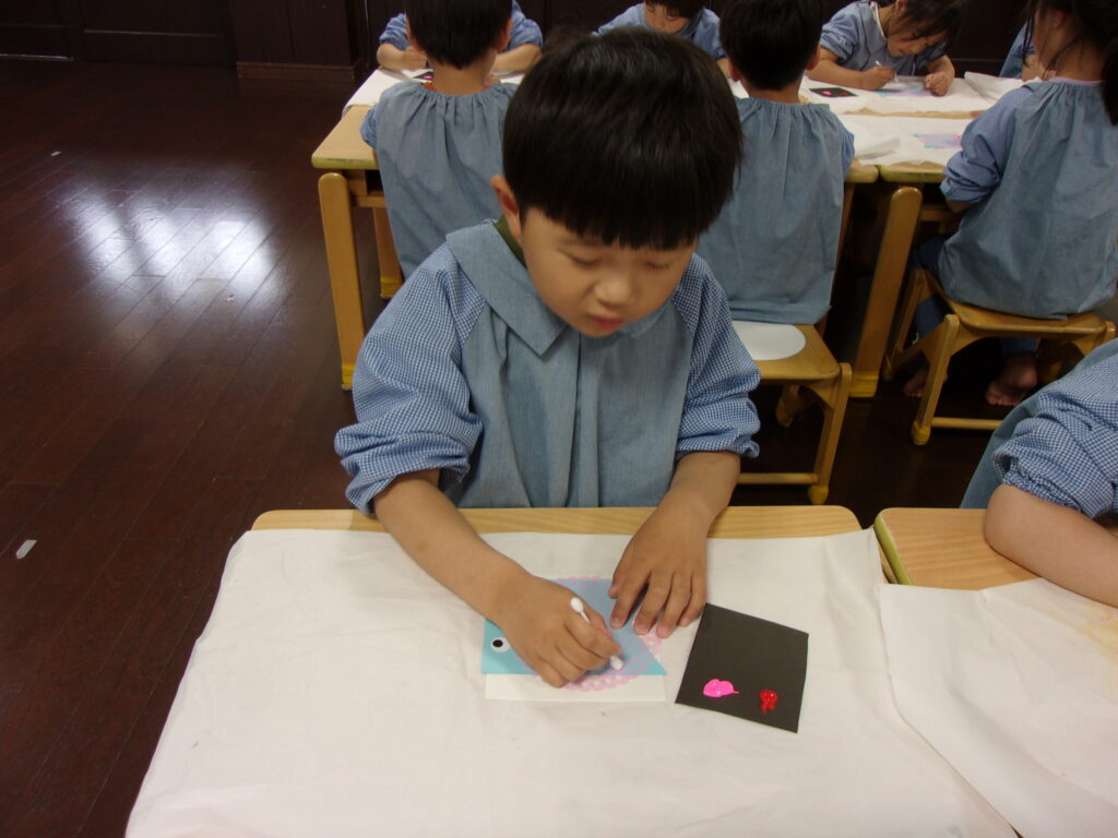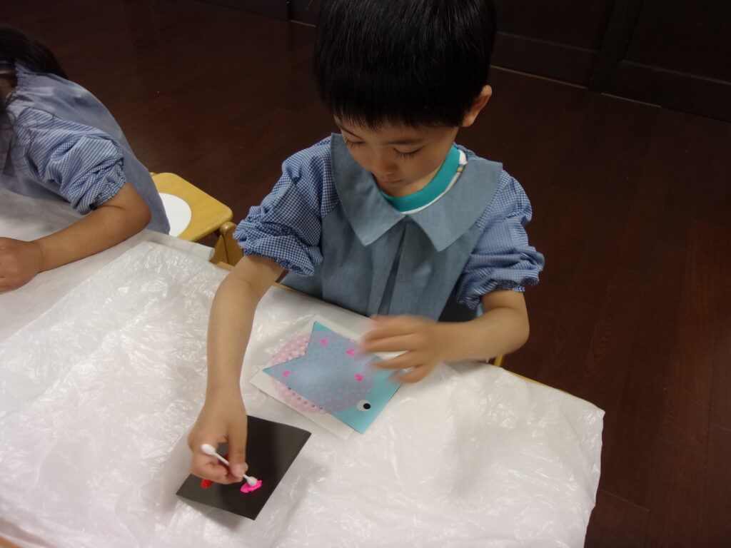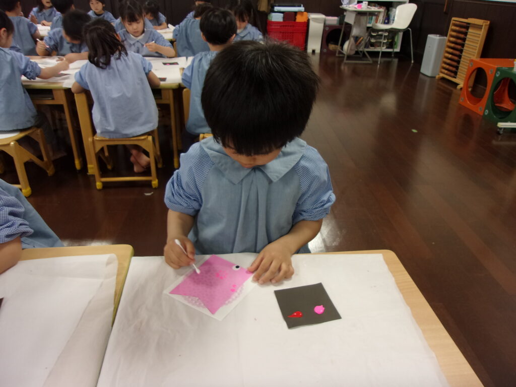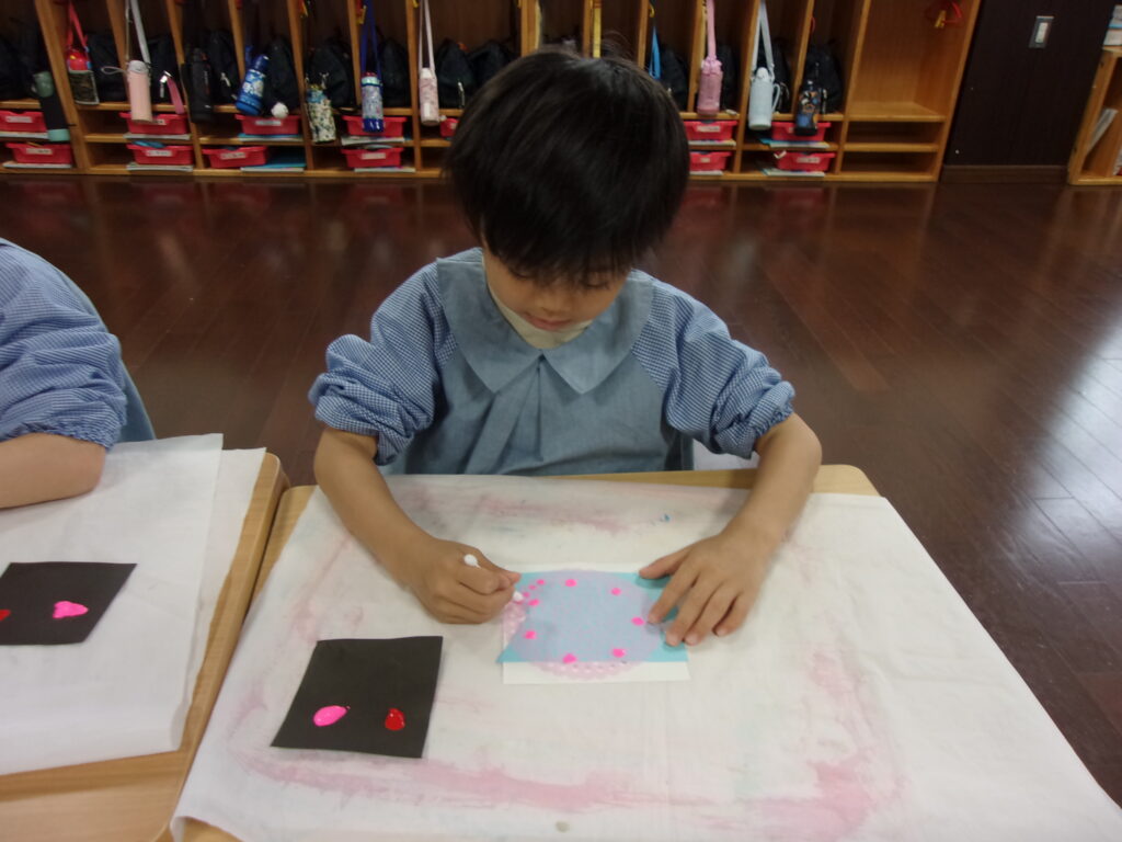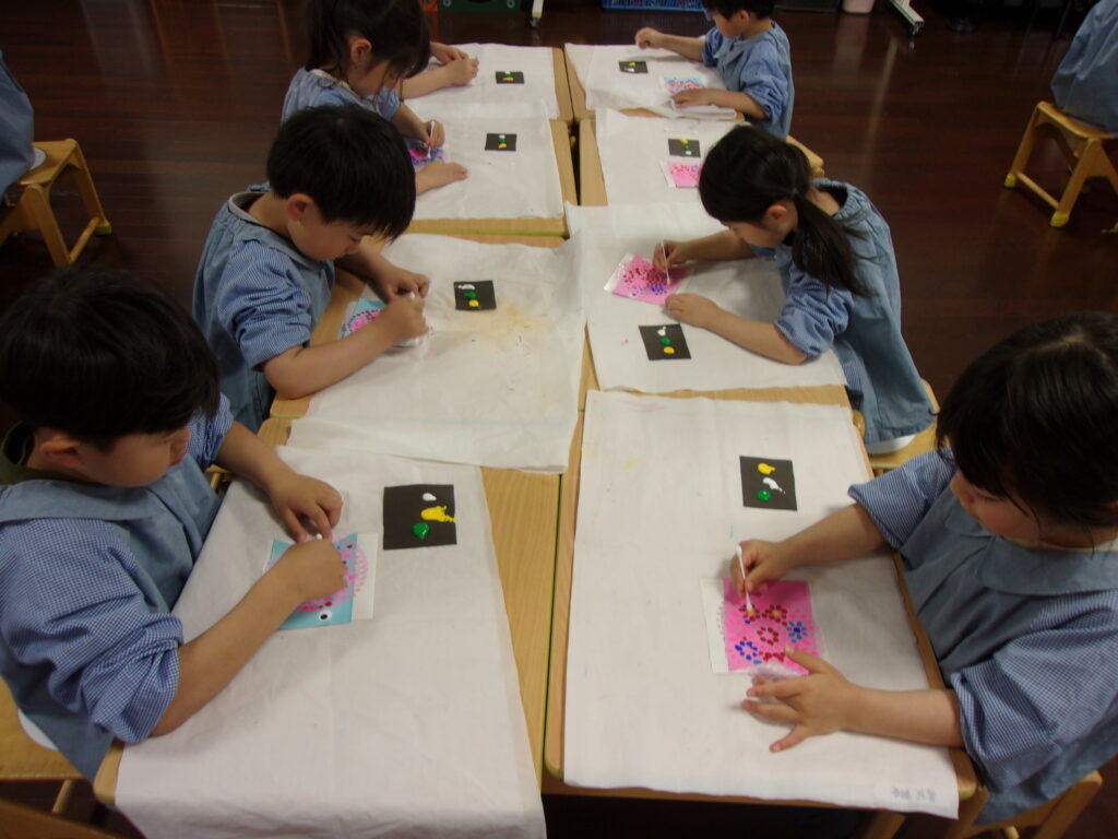 小さい折り紙でカブトを折ったり、綿棒を使って絵の具で色付けしたりと楽しく製作しました😊