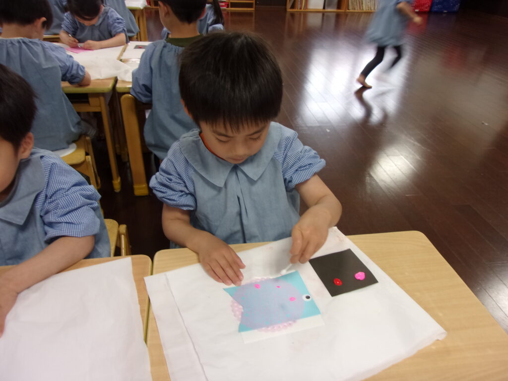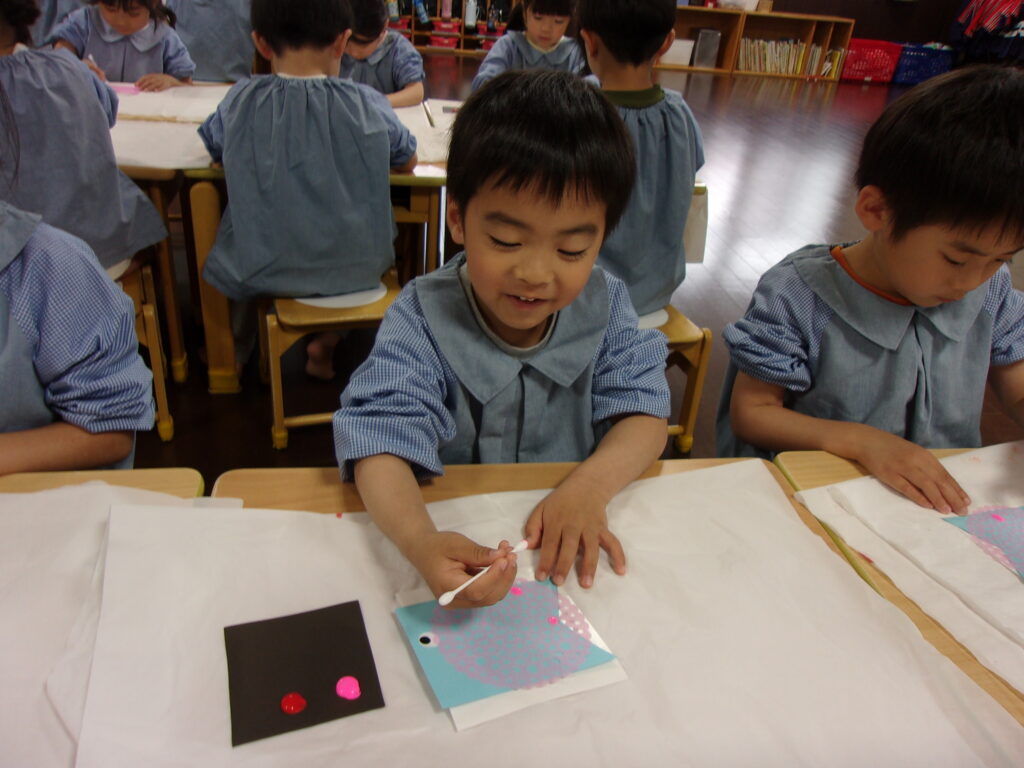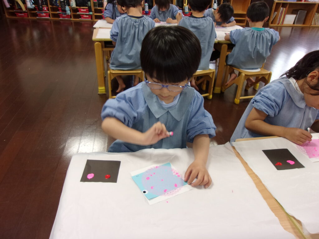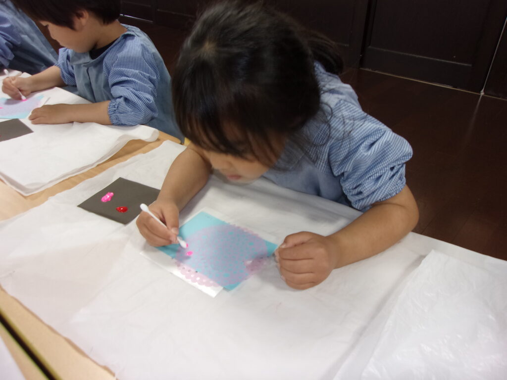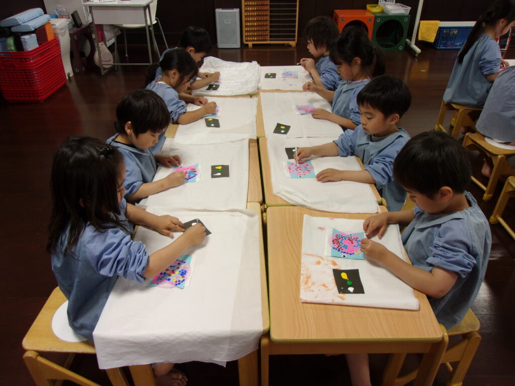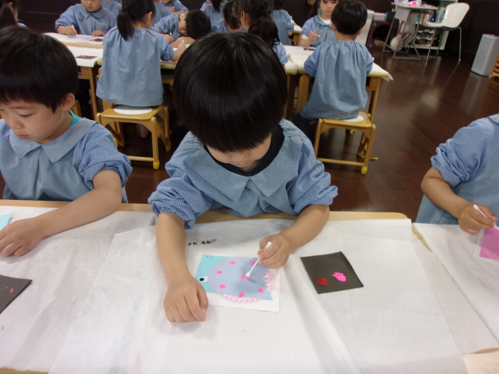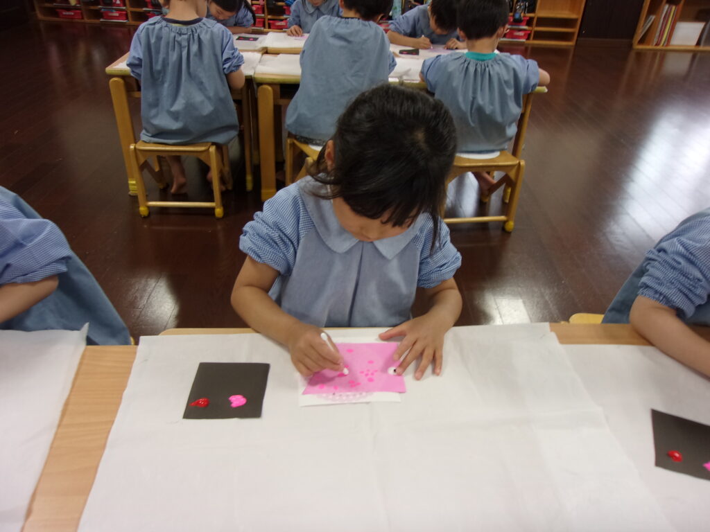 小さい折り紙でカブトを折ったり、綿棒を使って絵の具で色付けしたりと楽しく製作しました😊